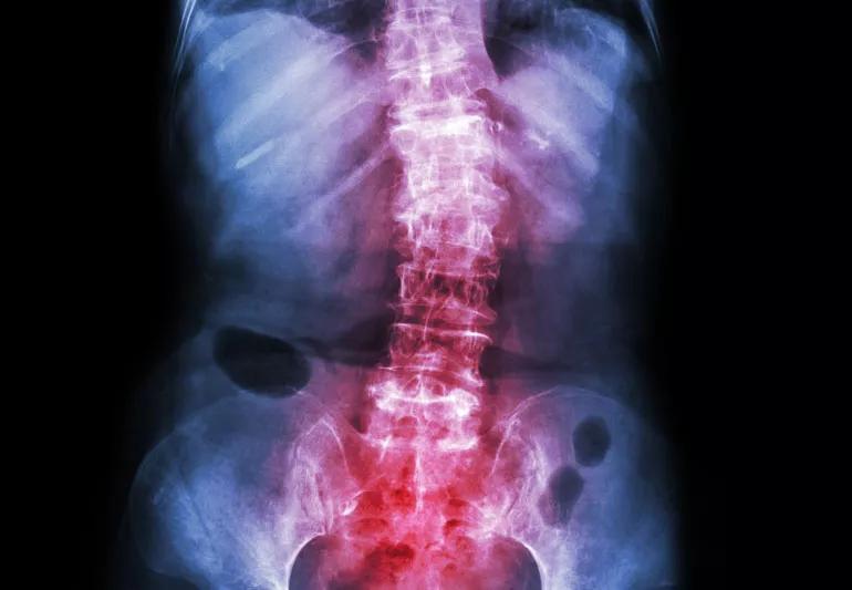 As you age, your spine begins to deteriorate. As it weakens, it may also begin to curve. Some people may never have any symptoms. Others might experience leg pain, numbness or tingling when walking and/or back pain.