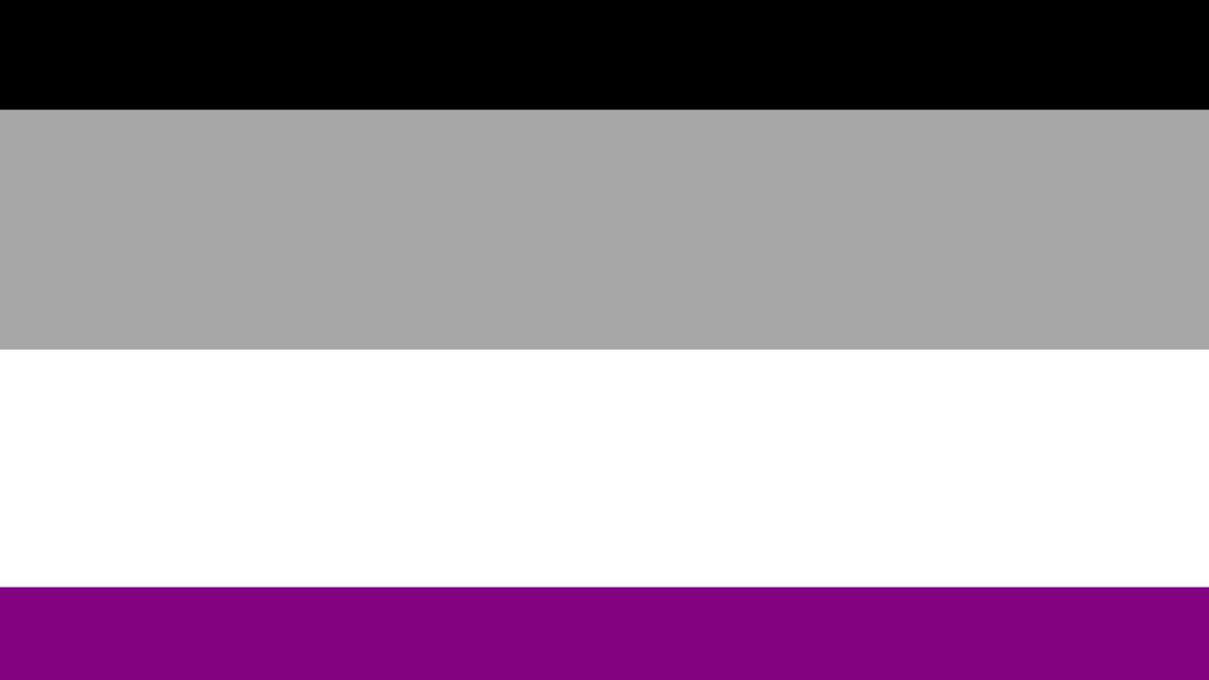 The asexual pride flag with stripes of black, grey, white and purple from top to bottom.