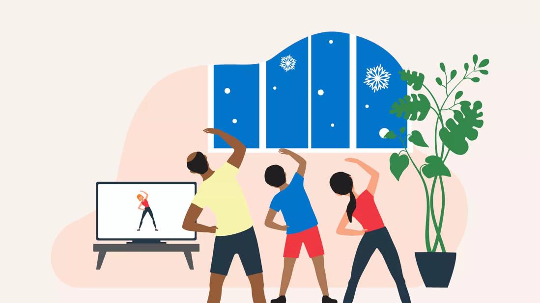 Family working out inside the house while it's snowing outside.