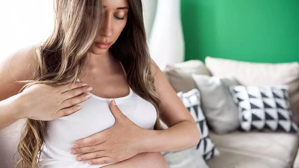 “You may feel a little more fullness in your breasts around that time and may even have a bit of leaking in the third trimester,” Dr. Lam says.