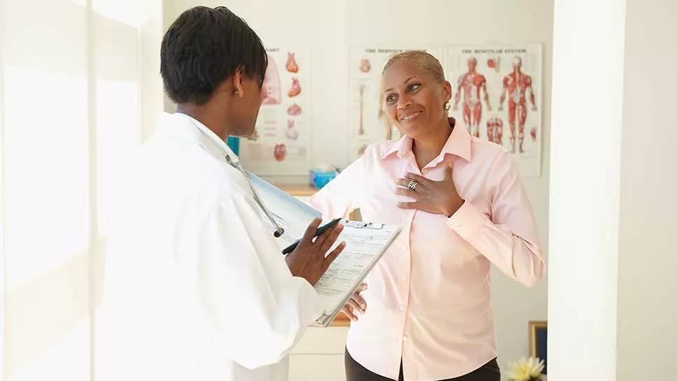 healthcare provider speaking with older female in office
