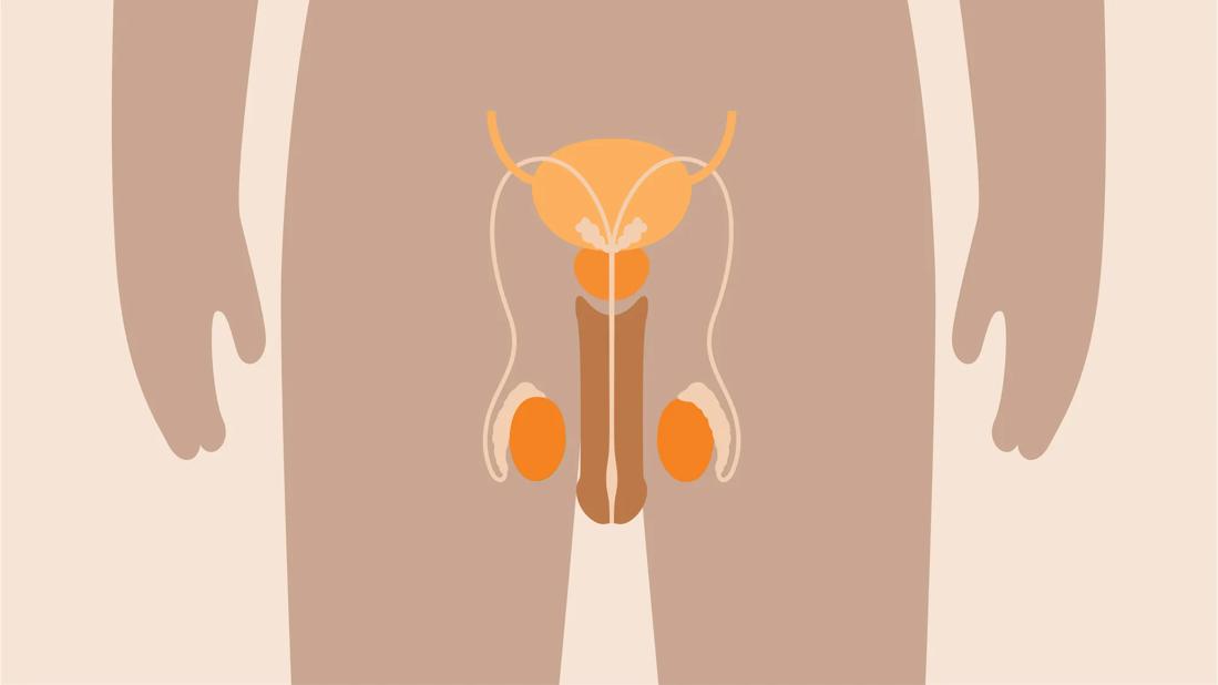 Graphic illustrating a penis and testicles on a body.
