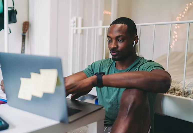 A man wearing a green shirt and sitting at his laptop working while wearing white earbuds
