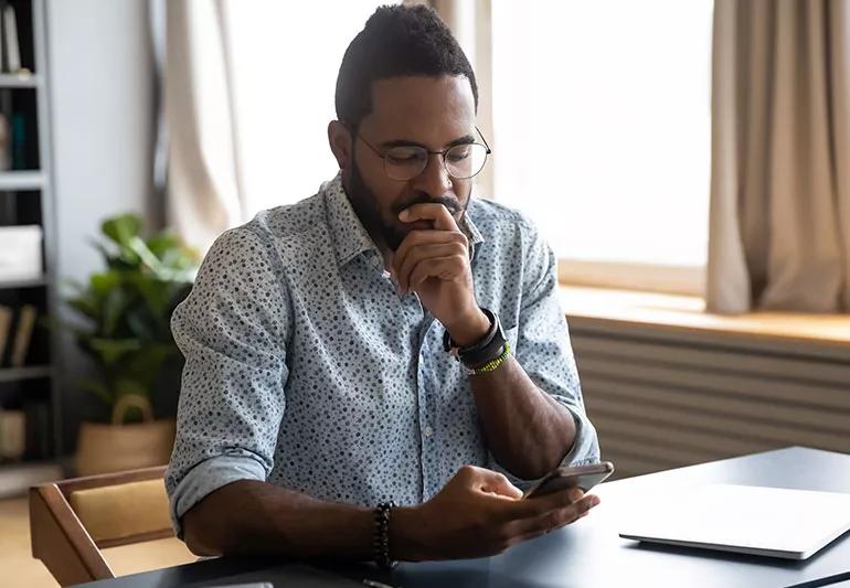 A person looking at their phone with a concerned and curious look on their face