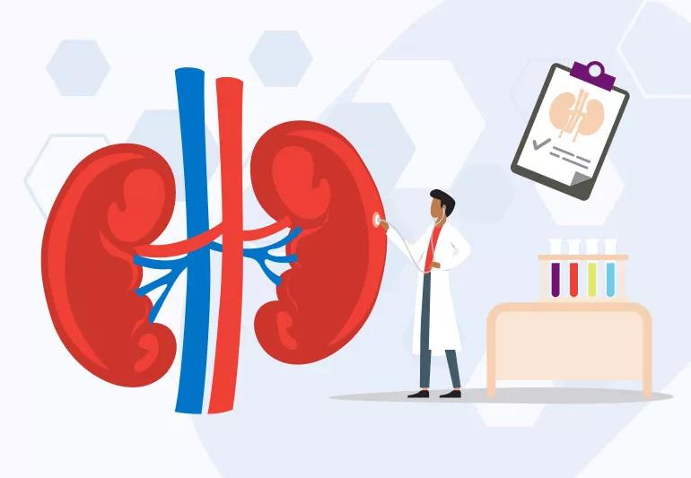 Illustration of doctor examining kidneys with test tubes and health chart in background.