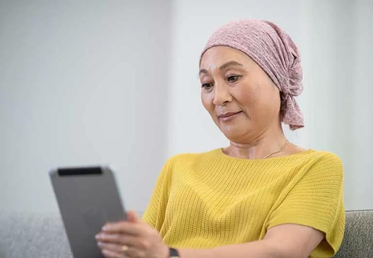 An immunocompromised person in living room on a tablet device.