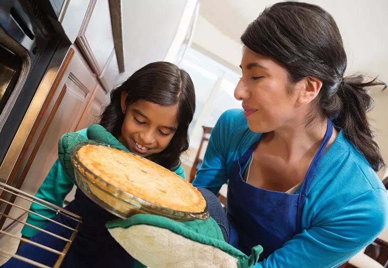 Mother a daughter remove pie from hot kitchen oven