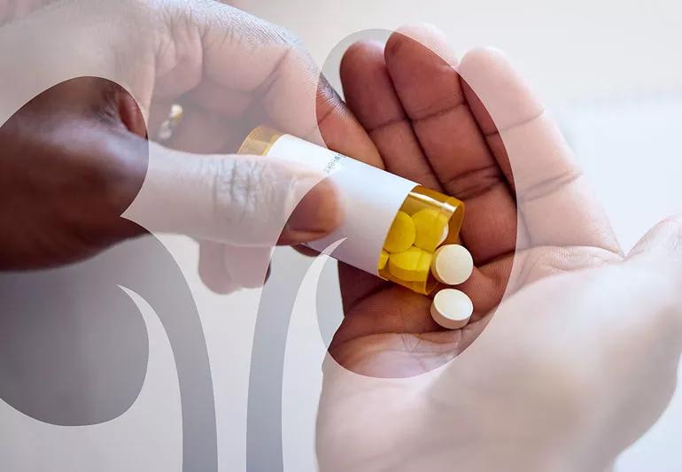 Person spilling pills from bottle into hand with shape of kidneys overlayed in the foreground.