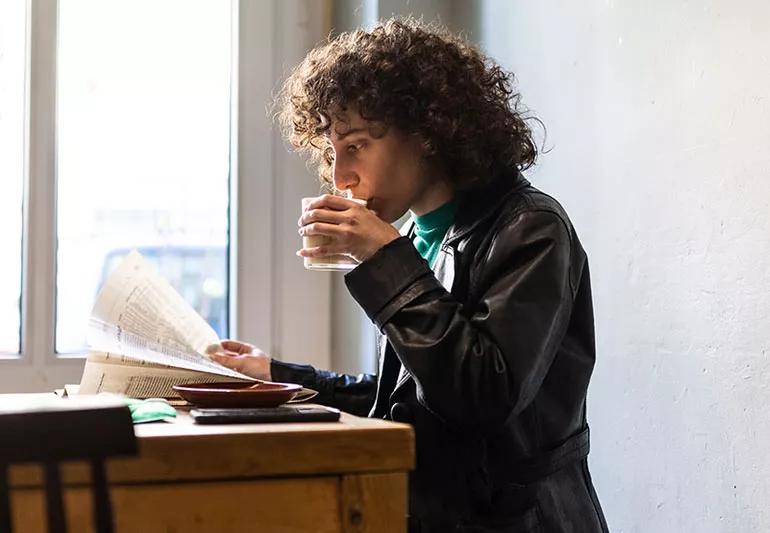 Nonbinary person drinking coffee and reading paper in a coffeeshop.
