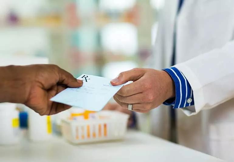 Person handing a pharmacist a prescription.
