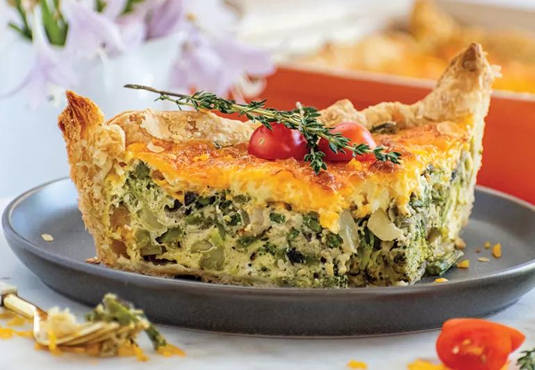 Quiche, an egg-based savory tart, originated in the Alsace-Lorraine region of France. This light dinner or beautiful brunch entrée offers a pleasant palate of fresh veggies. But, depending on seasonal availability, feel free to switch out your veggies to baby artichokes, broccoli, cauliflower, squash or fennel. Many mushrooms do well in quiche, as do oysters or even truffles for a real splurge. The whole-wheat pie crust is healthier than the typical pie crust (laden with saturated fats) and takes only a few minutes to mix and roll out. Enjoy!