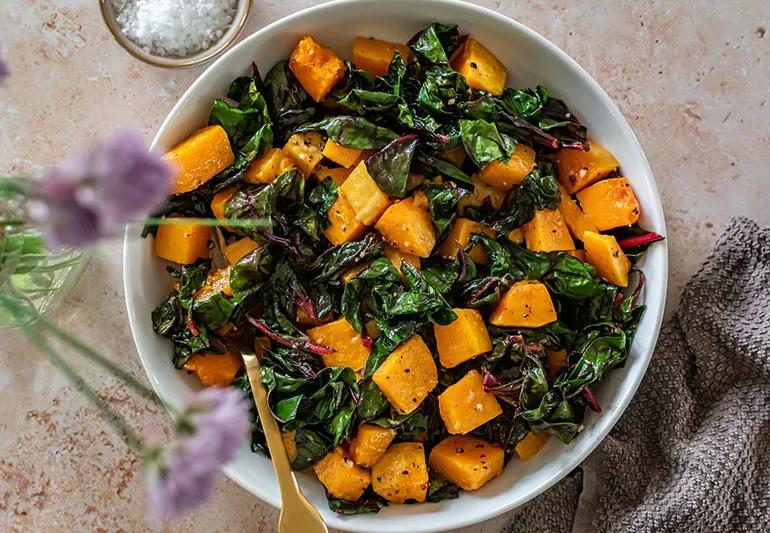 The key to this quick-and-easy recipe for Swiss chard is to spin-dry the chard after washing, otherwise, the excess water that clings to the chard dilutes the flavors. You’ll also want to cook the chard slow enough that it releases enough of its own moisture to thoroughly cook it until tender. And the roasted butternut squash is a wonderful and healthy way to sweeten the greens without adding sugar.