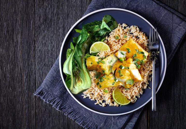 The tantalizing sauce features powerhouse plant foods like garlic, ginger, jalapeño pepper, curry and coriander, along with creamy coconut milk. The cod, rich in protein and good-for-you fats, poaches quickly in the sauce. Served over fiber-rich brown rice, with a side of steamed bok choy, this dish has enough substance and style to impress dinner guests, but it’s simple enough for a quick weeknight meal. The best of both worlds!