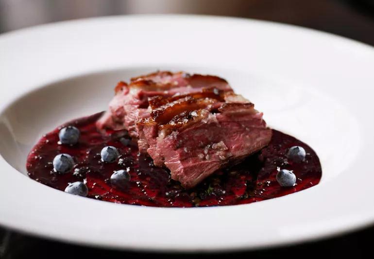 If you’ve never made duck breasts, you’ll be amazed how quick and easy this recipe is. The fruitiness of the blueberry sauce works wonderfully with the rich, crisp duck skin. Serve with asparagus, broccolini or green beans drizzled with olive oil, or use the extra rendered duck fat on the veggies. Ask for mild-flavored Peking duck at your market’s butcher counter.