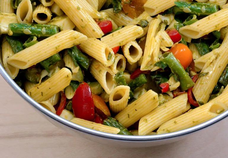 Enjoy this fresh take on a classic summer dish. Chickpea pasta offers a chewy, protein-rich complement to seasonal cherry tomatoes, green beans and sweet corn. Topped with simple oregano vinaigrette, this salad is sure to be a hit at your next summer barbecue.