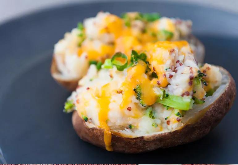 Stuff these baked potatoes with broccoli and cheese for a delicious side dish or a light lunch on its own or with a cup of soup. This recipe calls for skim milk and light cheddar cheese to keep fats low without sacrificing flavor. Only 90 calories per serving.