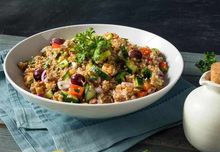 This salad offers the fresh taste of grape tomatoes, cucumbers and dill in an olive oil, lemon and vinegar dressing. Kalamata olives give it zing and whole-grain bulgur makes it satisfying.