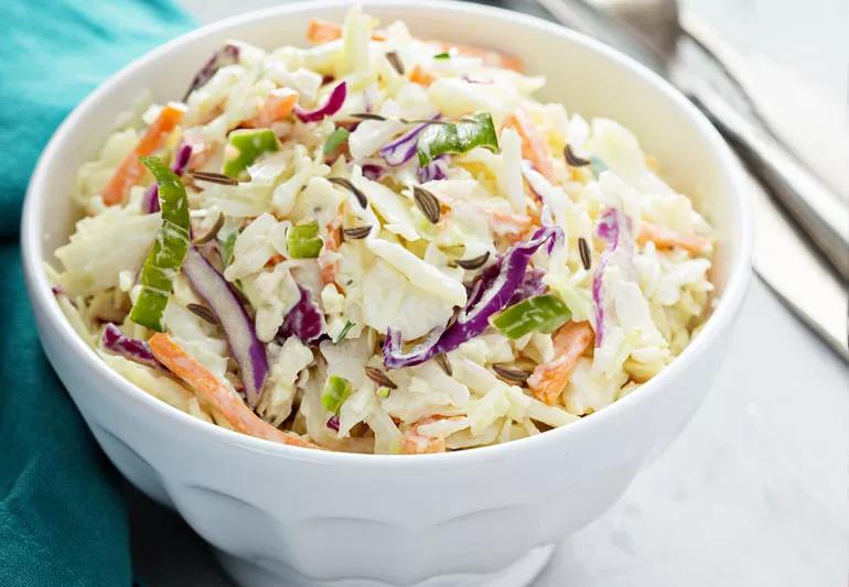 This revamped version of a summer classic is true to the original flavor (caraway seeds, of course, plus a nice mingling of sour and sweet), and the shredded cabbage and grated carrots provide that unmistakable, telltale crunch.