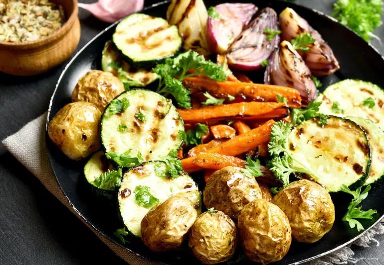 The great part about this recipe is that you don’t have to do any special shopping for it. Simply browse your current vegetable inventory and roast whatever you find. You can eat these vegetables as a side dish, use them as a pizza topping or slip them between two slices of whole-grain bread for a sandwich. You can even make an entree by serving the vegetables with brown rice, quinoa or pasta. Don’t worry about overcooking your veggies, either: It only improves the flavor. Whichever way you use this recipe, you’ll be getting a good dose of vitamins C, A, E and phytonutrients.