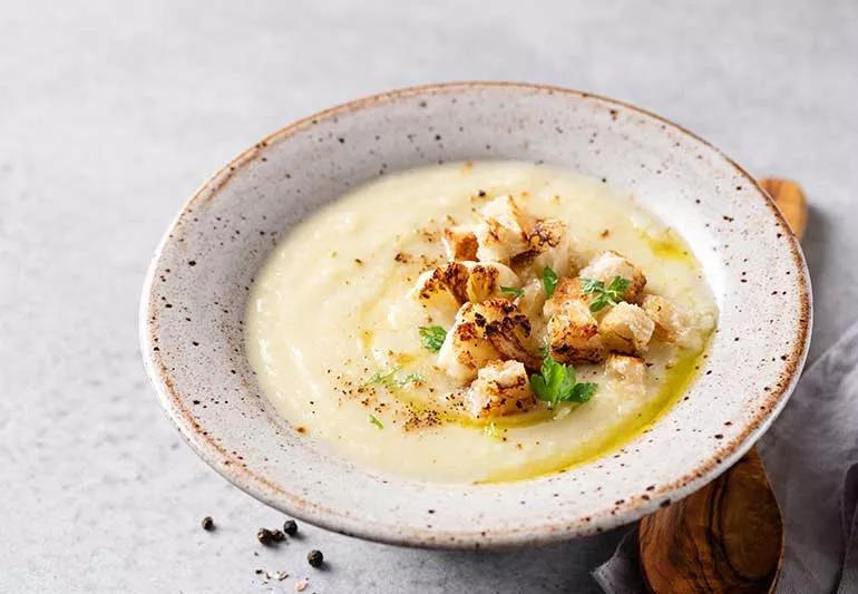 This delicious roasted cauliflower cheddar soup is seasoned with thyme and rosemary for superb flavor. Use reduced-fat chicken broth, low-fat milk and reduced-fat cheese to keep the fat and calories in check.