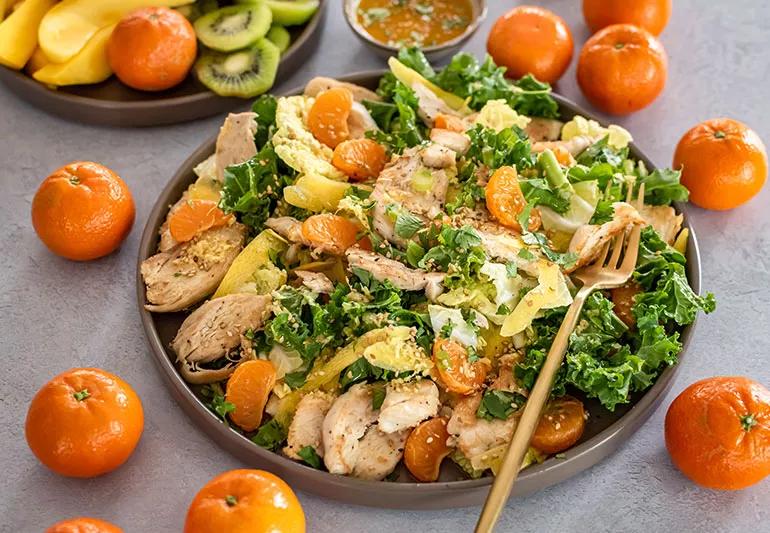 Our Asian-inspired salad is not only loaded with flavor, but also a snap to make. The bed of Napa cabbage, kale and carrots offer a satisfying crunch and loads of nutrients, while the cilantro, scallions and sesame elevate the flavor even further. And the vinaigrette? An easy-to-create combination of fresh mandarin orange juice, lime juice, toasted sesame oil and ginger will have your tastebuds singing. Enjoy for lunch or a simple weeknight dinner.