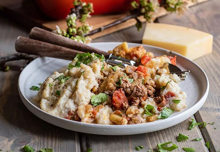 This easy casserole features spiced ground lamb, but it works with beef and bison as well. And while the top might look like traditional high-carb mashed potatoes, we used pureed cauliflower instead. You will love the switch!