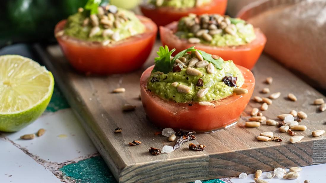 Tomatoes stuffed with poblano peppers and avocado.