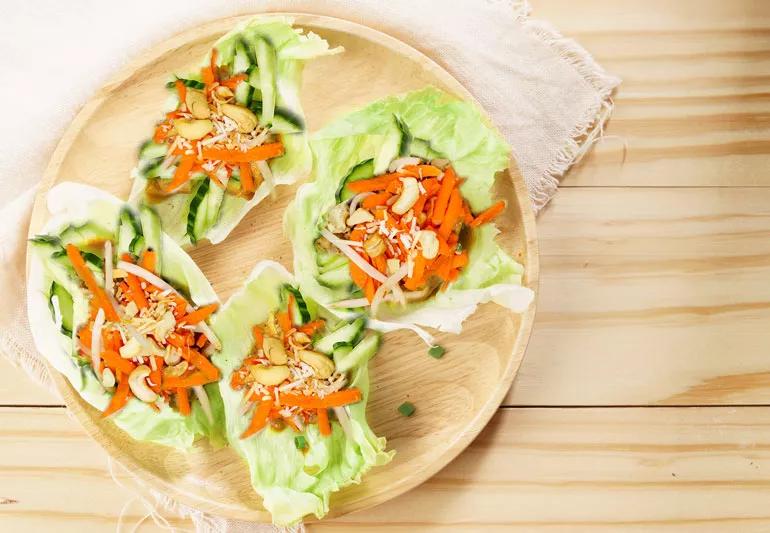 In our Thai Lettuce Cups With Spicy Cashew Dressing recipe, crunchy vegetables, fresh herbs and avocado rest in the “cup” formed by Boston lettuce leaves. The dressing elevates it to the next level: Cashew butter, lime juice and Sriracha sauce combine to form a creamy dressing that will dance on your tongue with just the right amount of tang and heat. Scallions add yet another pop to the flavor symphony.