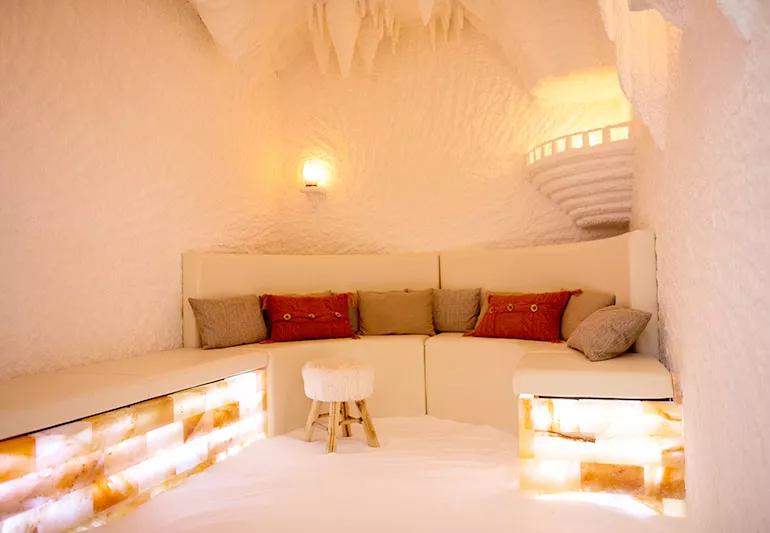 Salt rooms deliver a dry salt therapy experience, where the air inside the room exposes you to microscopic salt particles. There are two types of therapy rooms, according to the Salt Therapy Association: