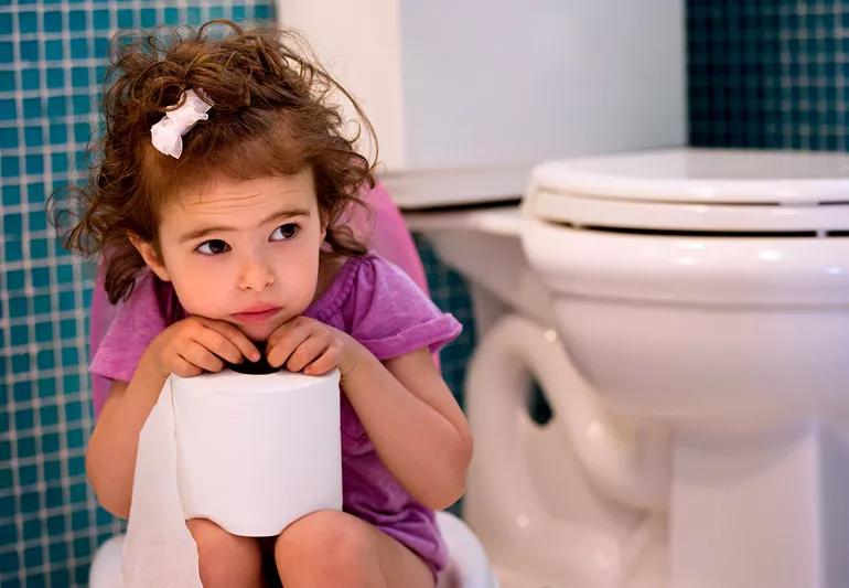 sad little girl with UTI sitting in bathroom