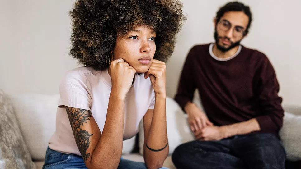 Female sitting on couch staring blankly ahead, with male next to her on couch staring at her