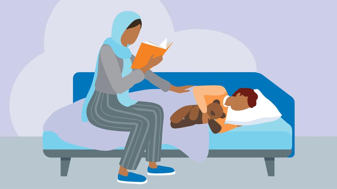 Parent reading to their sick child who is in bed.