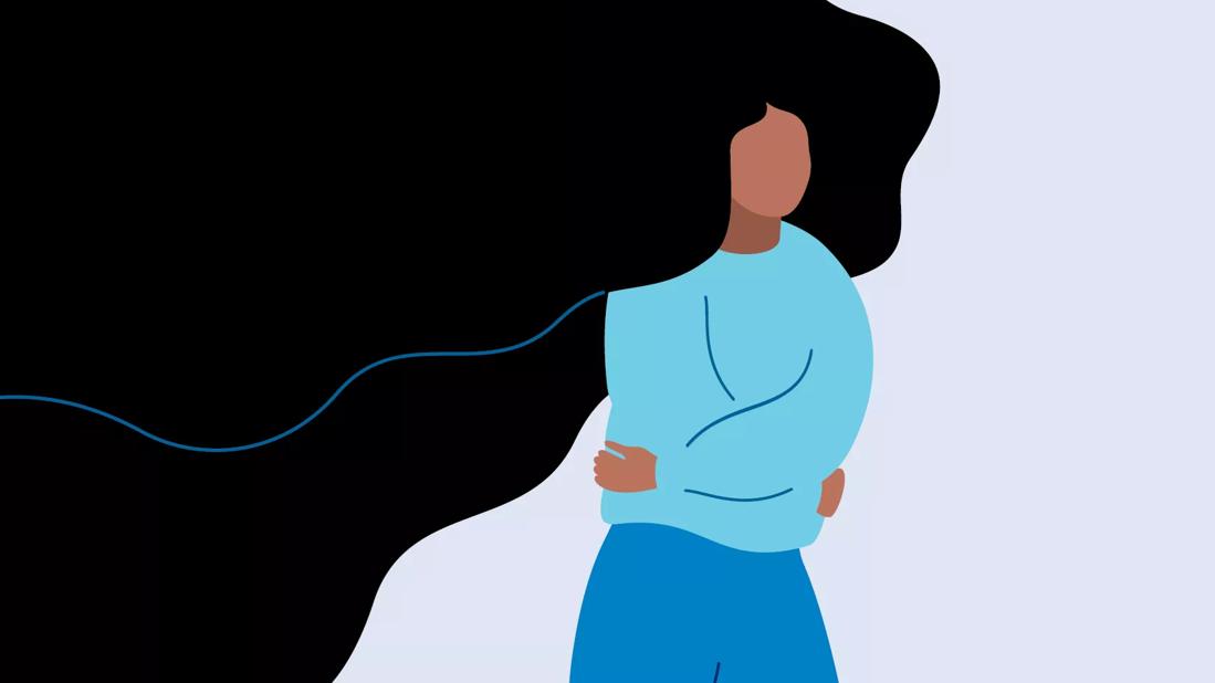 Illustration of a woman hugging herself beneath a dark cloud of black hair that represents treatment-resistant depression.