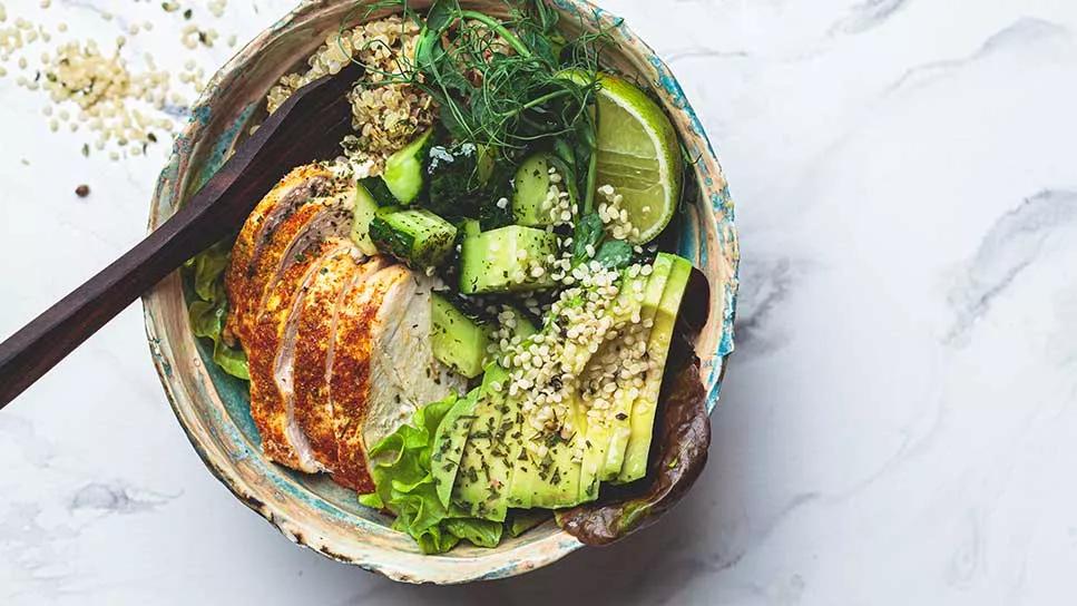 bowl filled with roasted chicken, avocado, quinoa, pickles and herbs
