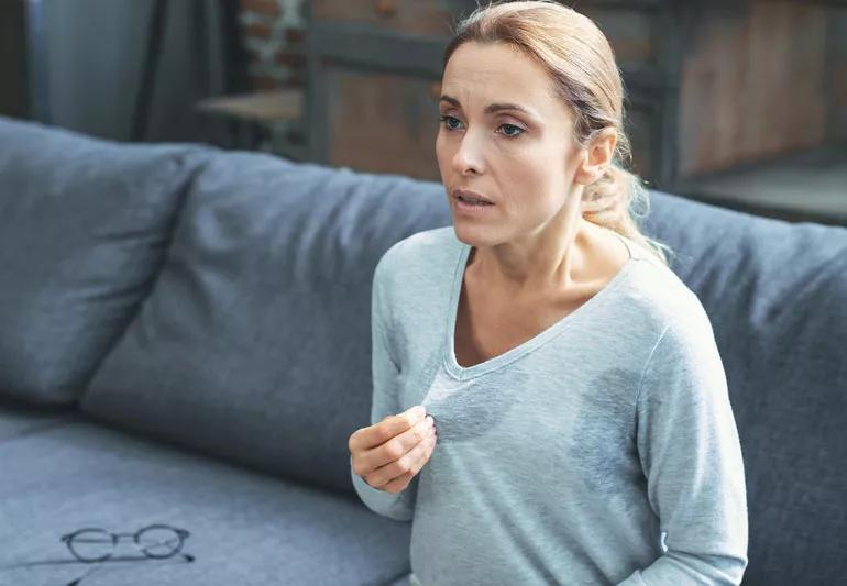 Person sittin on couch suffering from a hot flash, with wet patches showing on shirt.