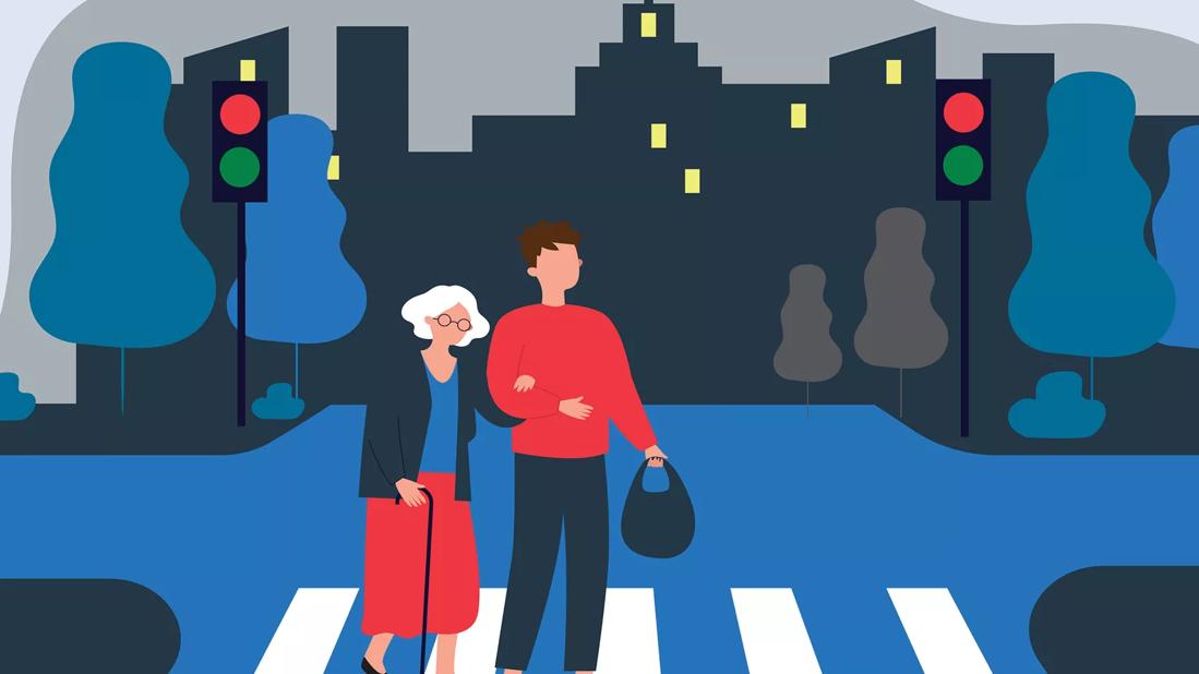 Young adult helping an elderly citizen cross a city street at night.