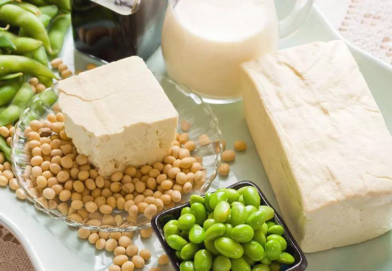 A collection of foods like tofu, edamame and soy milk