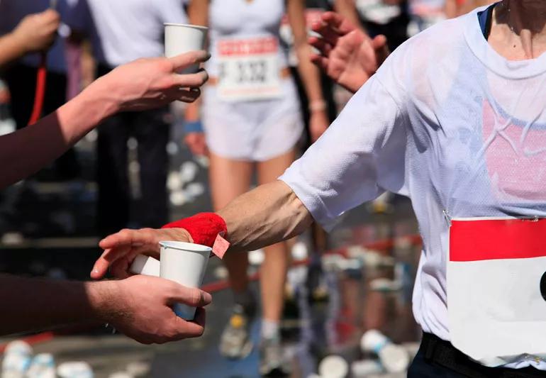 During the race – Keep drinking water, but also add a sports drink that replenishes the electrolytes, sodium and potassium you will burn after the first hour and a half. Energy gels are fine (provided you have trained with them and know they won’t upset your stomach).