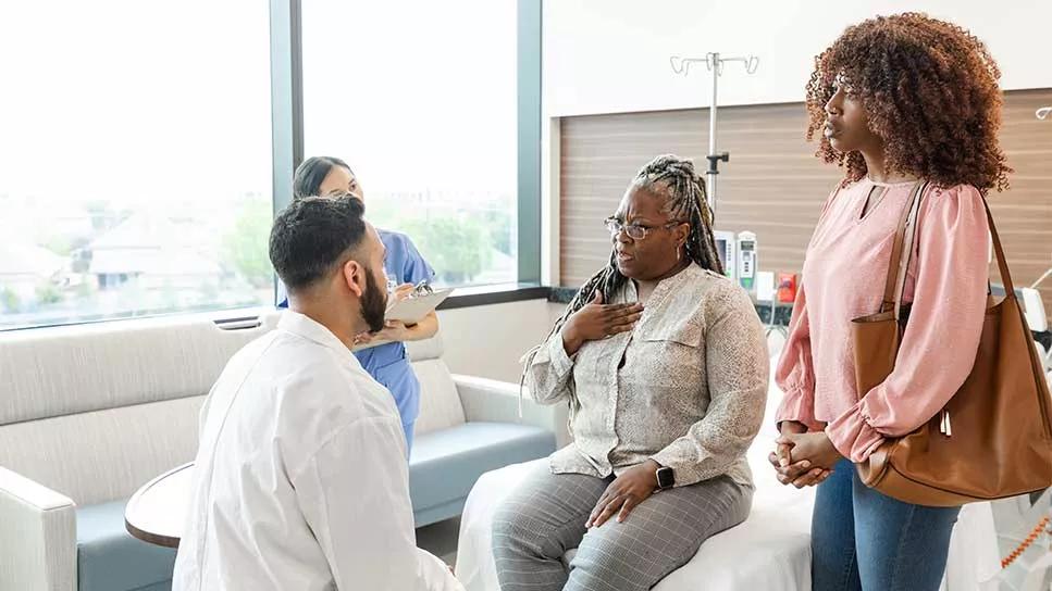 seated doctor and female in doctor office, with female's hand on heart, with daughter