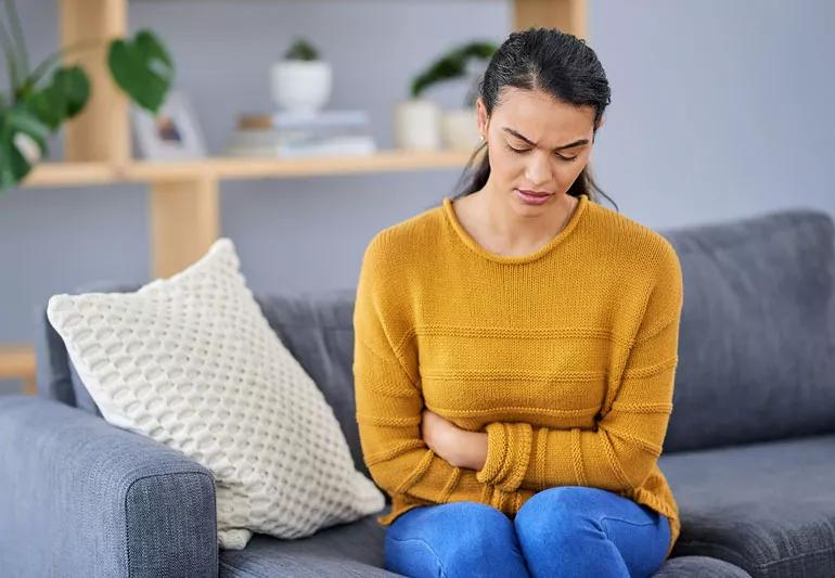 Woman sitting on couch with stomach pain