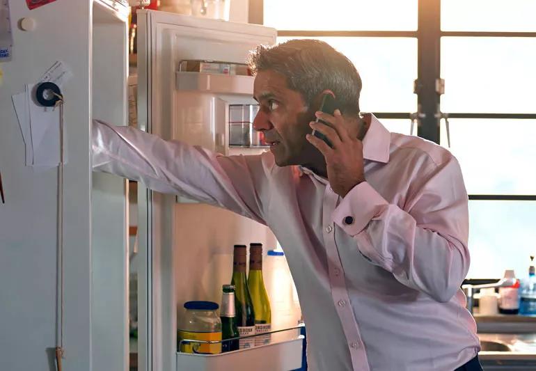 Man looking in refrigerator to find unspoiled food after power outage