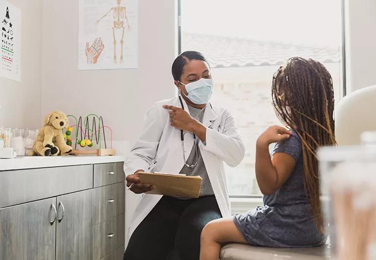 Masked doctor and child point at their shoulders during appointment