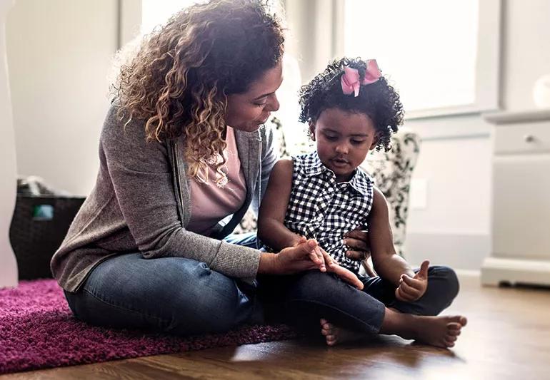 A woman sitting on the floor talking to a child.