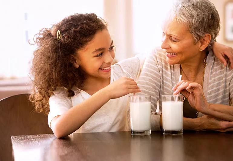 Grandmother and granddaughter enjoying glasses of milk or soy milk